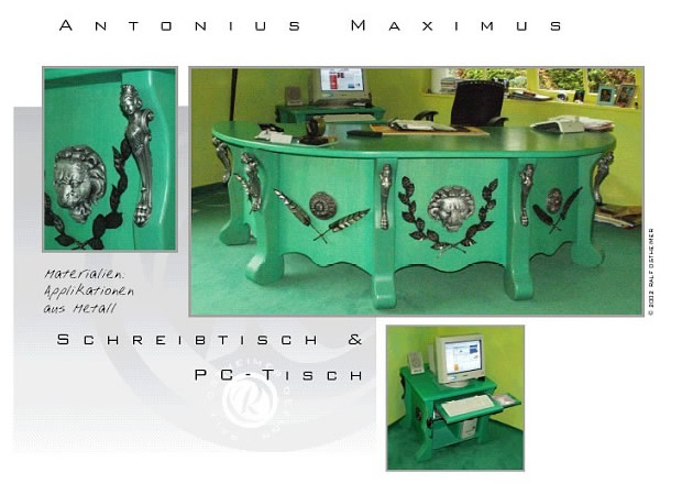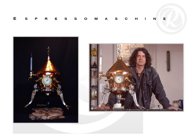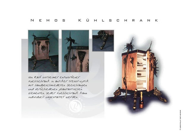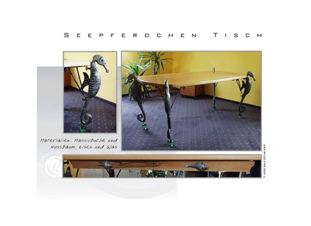 Espressomaschine | Nemos Kühlschrank | Humidor | Sprechende Uhr | Seepferdchen Glastisch | Seepferdchen Tisch | Antonius Maximus | Konferenztisch | Drachenbank im Jugendstil | Löwenbank | Großuhr | Uhr mit Sonne | Astronomische Großuhr | Pendelleuchte | Python Handlauf | Handlauf | Vorhangstange u. Wandleuchte | Die Kleinen | Pfauenauge Blau | Seepferdchenlampe | Bluestar | Redstar | Stammbaum | Steinlampe | Treibholzlampe | Kontrabass | Entenfrau | Männerbar | George Bush als Pfeffermühle & Erdöllampe | Engelsbote | Balance-Akt | Frau aus der Saat | Luna | Oh Mann | „Grass“er Unschuldsengel | Don Quijote | Sanjo Panza | Fighter | Balance | Es | Diven | Sonnenanbeter | Wächter | Kopfstand | Mafiosi | Der Zauberer | Engelsbote | Brunnenprojekt in Wiesbaden |